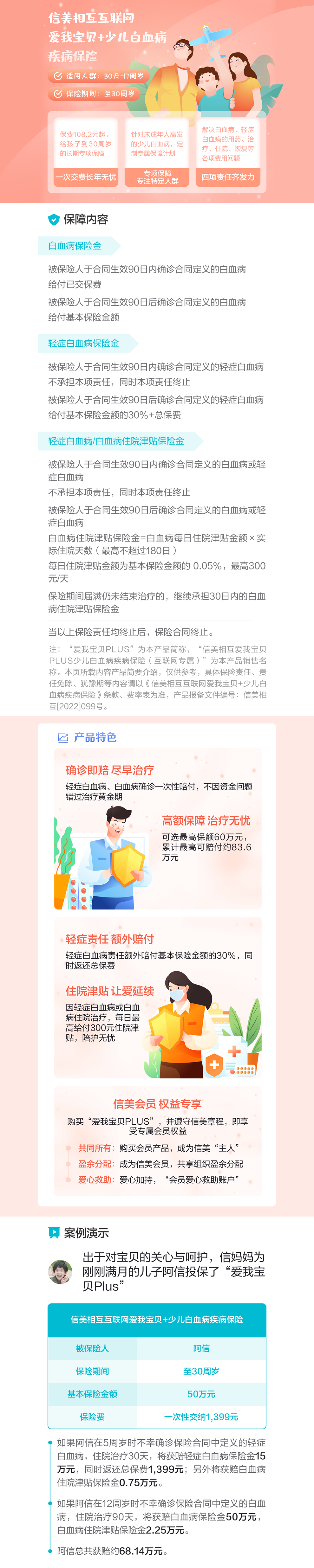 如果阿信在5周歲時不幸確診保險合同中定義的輕癥白血病,住院治療30天,將獲賠輕癥白血病保險金15萬元,同時返還總保費1399元;另外將獲賠白血病住院津貼保險金0.75萬元。